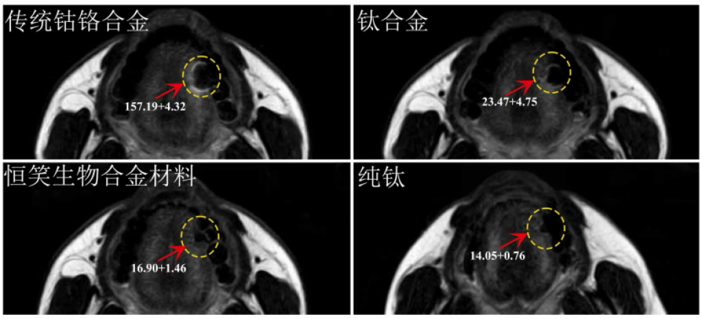 恒笑®超微熔覆义齿凭借特殊的生物合金与超微熔覆工艺,实现了关键突破。根据上图报告可以看出,恒笑®超微熔覆义齿的核磁伪影面积和钛冠一致。众所周知,钛作为植入级材料,被广泛应用于牙科、骨科等领域,其稳定性和核磁兼容性已被反复验证。