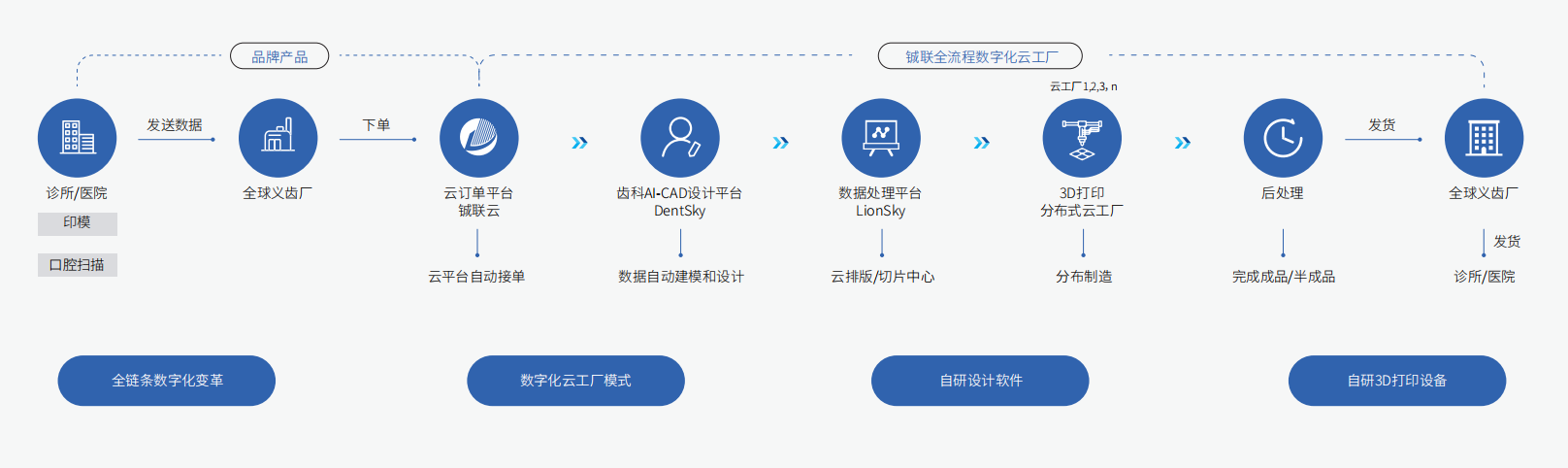模式创新:公司创新性地推出了“互联网+3D打印”的分布式制造云平台,全球义齿工厂只需通过铖联云平台发送任务需求,平台数字化设计团队即可在线进行工业CAD设计和数据处理,云平台的智能生产调度系统将打印任务分配到最优的云工厂完成生产制作,最后通过智慧物流系统将产品快速交付到用户的手中。