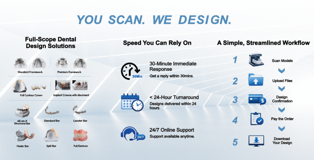 铖联科技在展会现场同步呈现了其系统化、专业化的牙科设计服务能力。依托成熟的数字化设计流程与稳定的质量标准,铖联科技可为牙科实验室提供覆盖多种修复场景的设计支持。